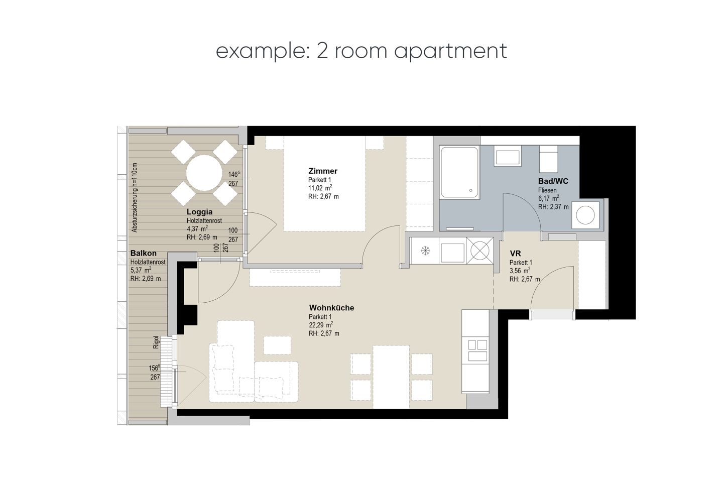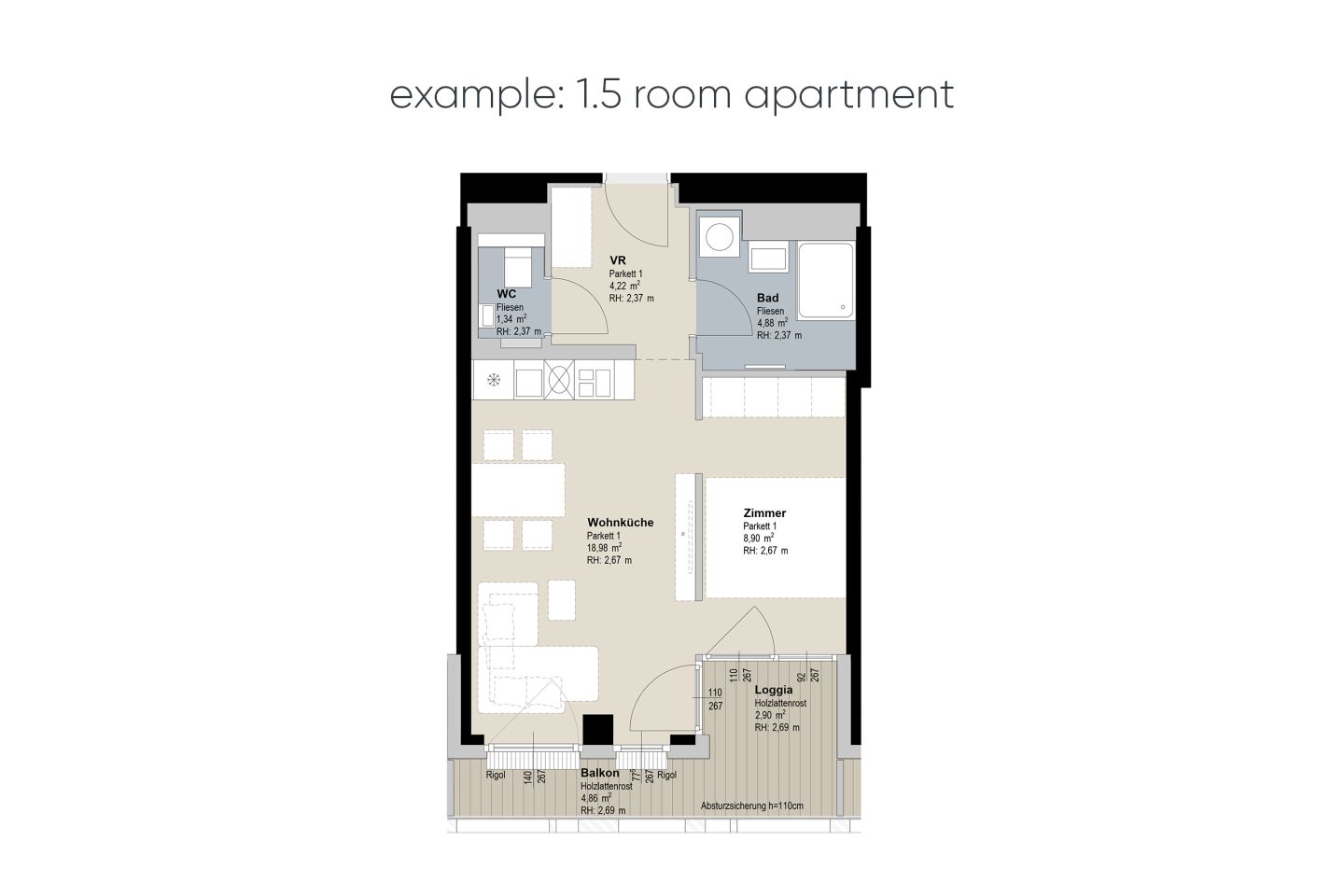 - The apartments have 1.5 to 4 rooms with living spaces ranging from 38 m² to 125 m².