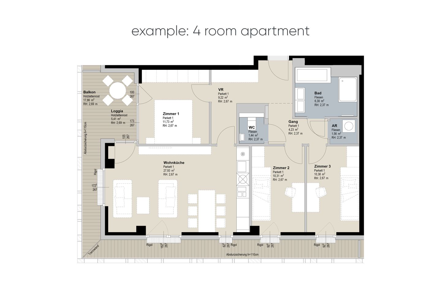 - All apartments are equipped with high-quality Weizer parquet flooring and offer a pleasant living environment all year round thanks to modern ceiling cooling and underfloor heating.